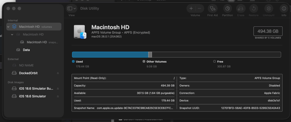 Mac Studio with 512 GB of space and yet somehow almost 300 GB was unaccounted for? Often I leave the system running (it sips power at idle and is mostly solar powered) and mostly don’t install apps just run various terminal and text apps, nothing terribly heavy. Well, maybe local AI plays a part? Also apparently Time Machine can sometimes unnecessarily lock up space. There are a few variables to pin down here. Time Machine, Xcode, half dozen Terminal windows, Affinity? There are few different processes that could be causing a disk leak? (As opposed to a memory leak.)